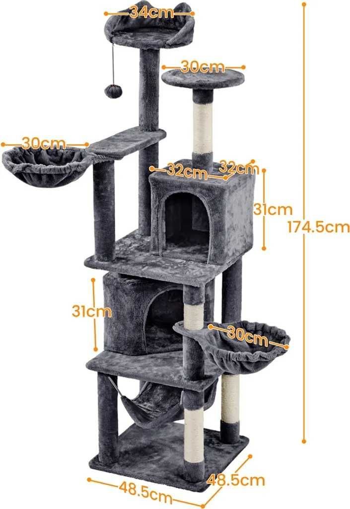Wielopoziomowy i wieloramienny - ten drapak o wysokości 174,5 cm zawiera 2 leżaki, 2 jaskinie, 1 hamak, 1 kosz i 1 pluszową piłkę na różnych poziomach. Wszechstronny i wielofunkcyjny plac zabaw dla kotów!