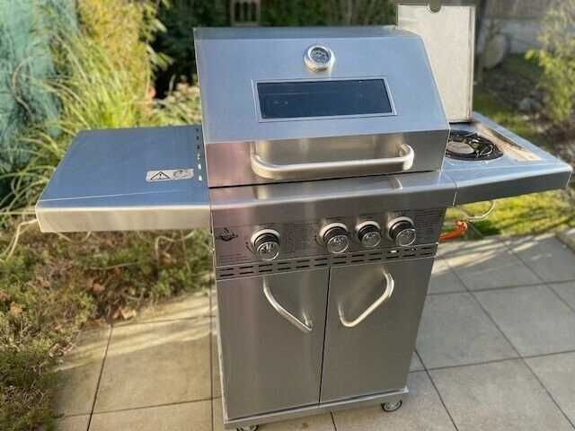 SOLIDNY GRILL GAZOWY NIEMIECKIEJ FIRMY EL FUEGO Z ŻELIWNYMI RUSZTAMI I SZYBĄ W POKRYWIE DZIĘKI KTÓREJ PRZEZ CAŁY CZAS MASZ WGLĄD NA SWOJE POTRAWY! W CAŁOŚCI WYKONANY Z NIERDZEWKI !