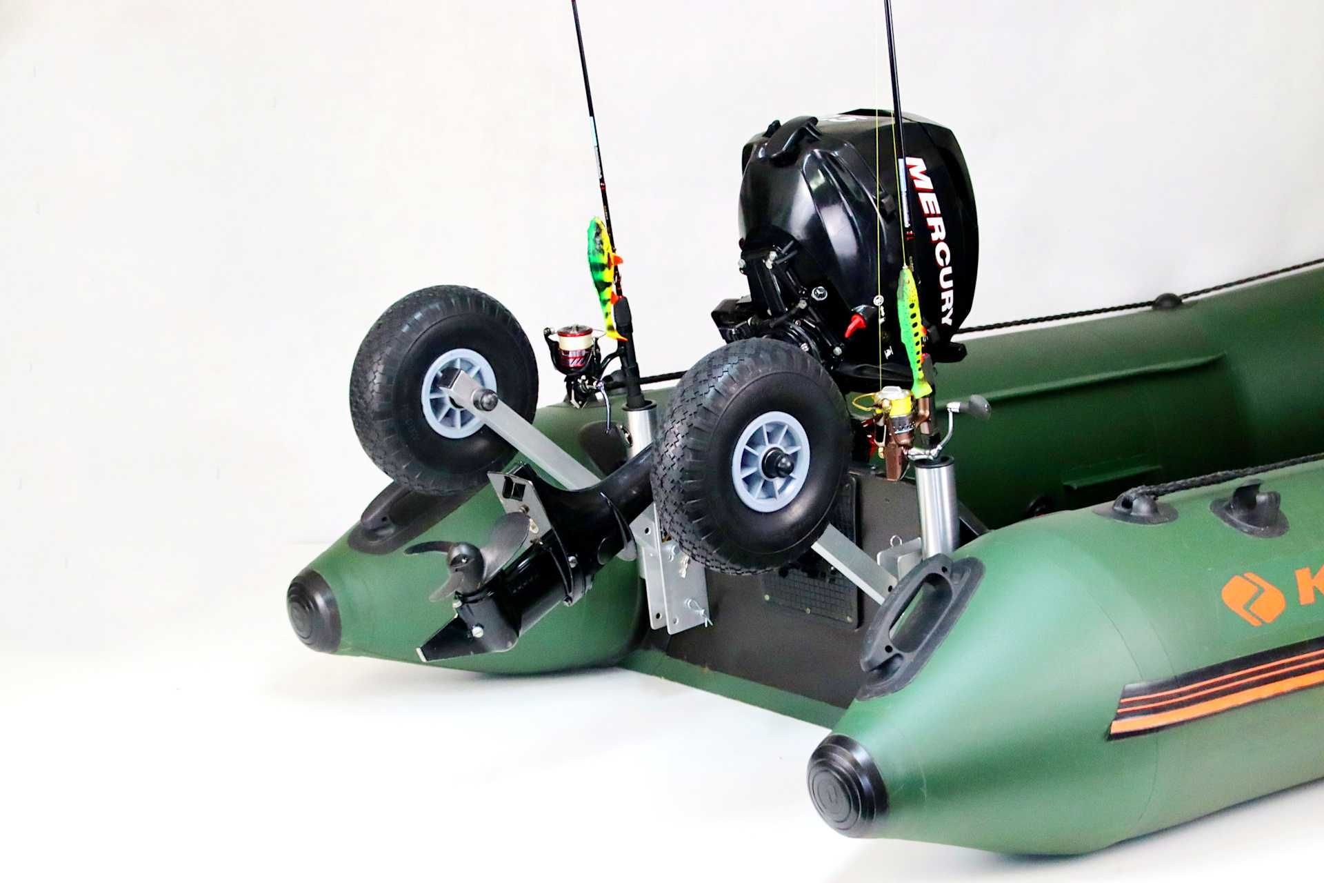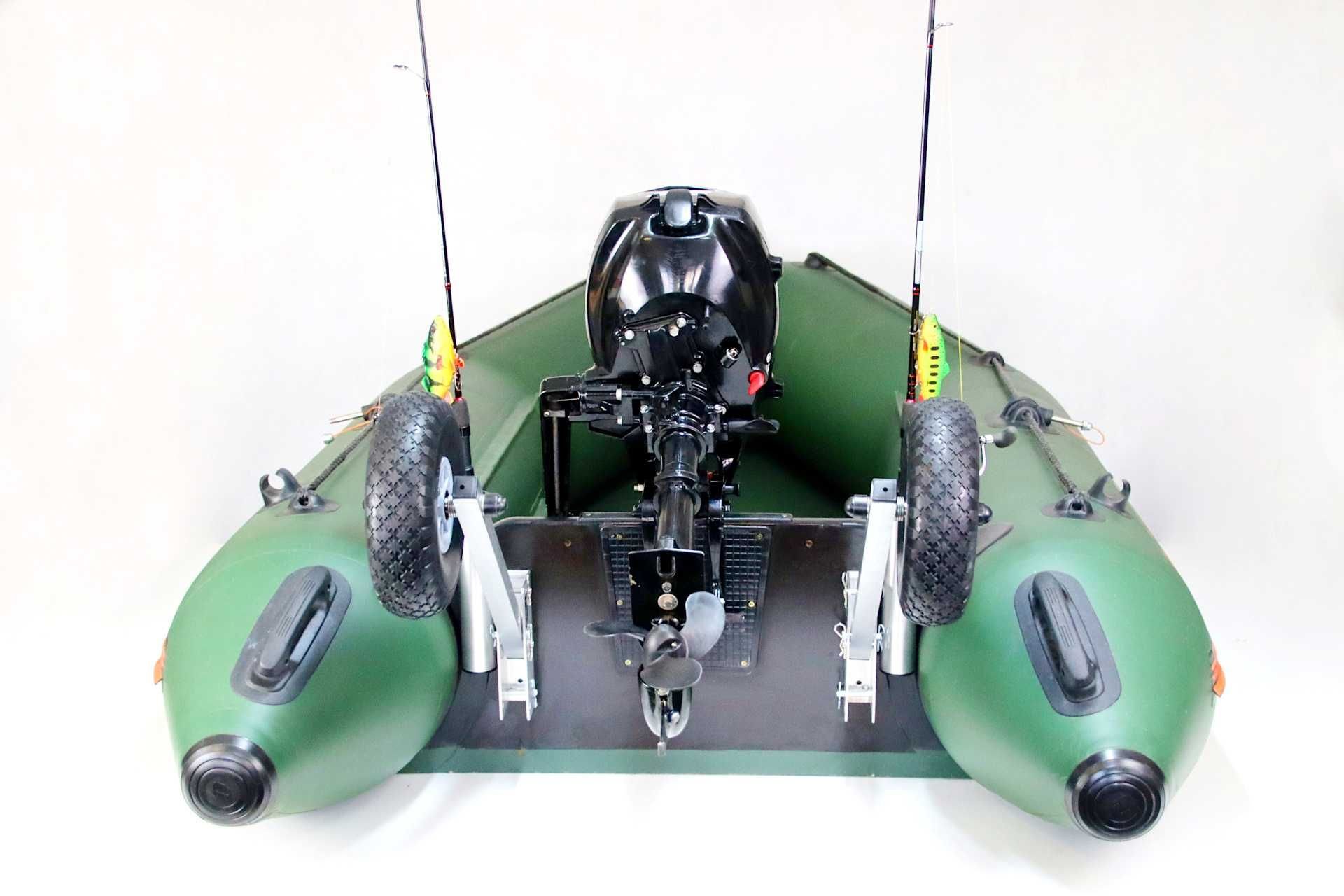 - Koła w pozycji dolnej (pomagają zwodować ponton i ochronić śrubę silnika przy