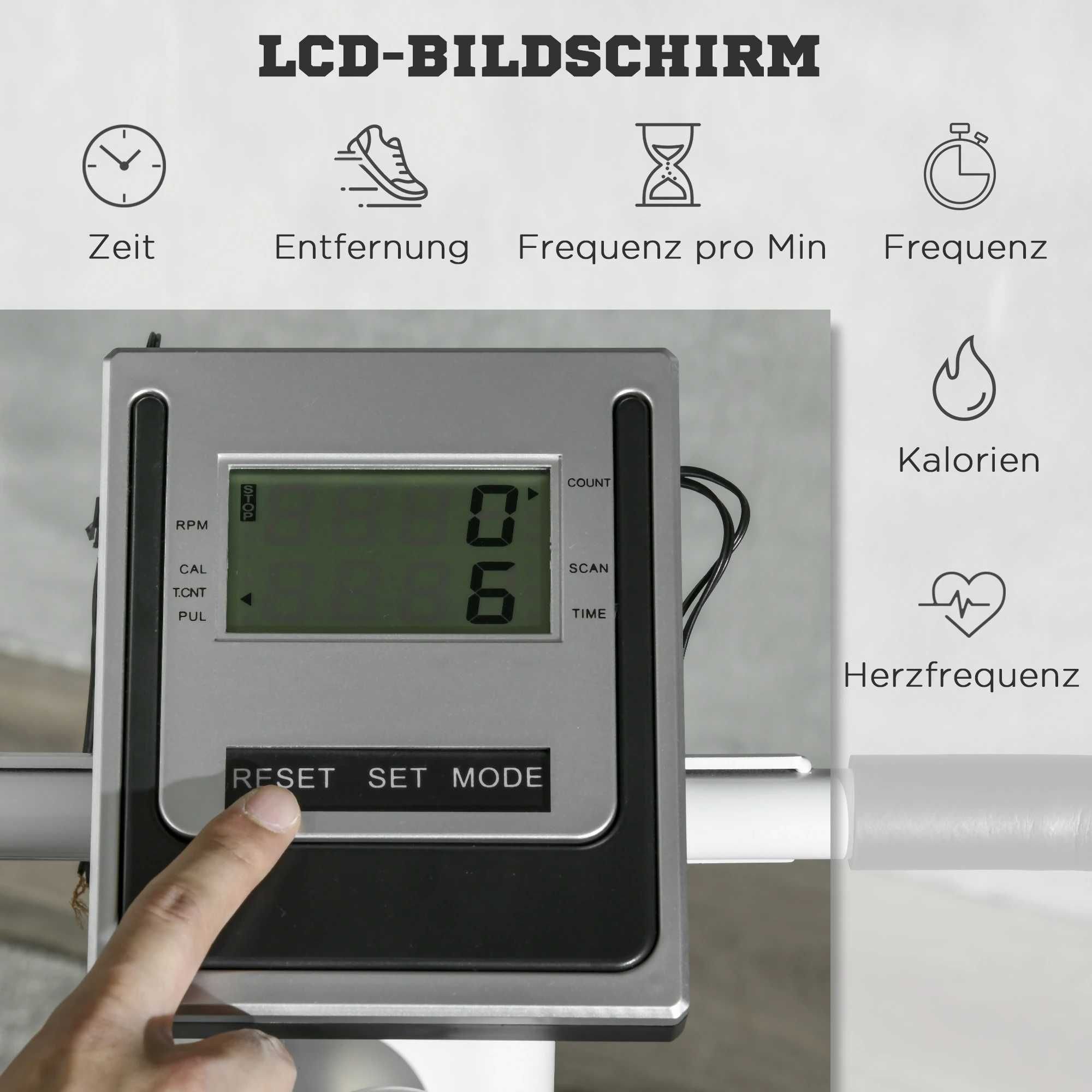 WYŚWIETLACZ LCD: Pokazuje tętno, czas, częstotliwość, dystans i kalorie. Precyzyjnie skalibrowane dane zapewniają skuteczne odniesienie do planu treningowego.